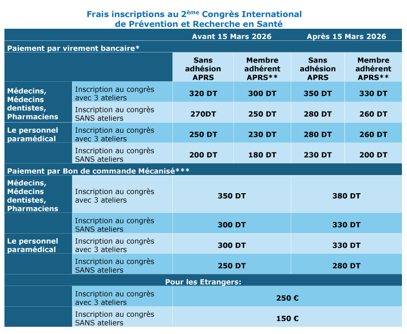 - Effectuer le paiement par virement de 30 DT au profit de l’Association Prévention et Recherche Scientifique (APRS): RIB: 11105002554200878850, UBCI Monastir (objet : adhésion APRS)